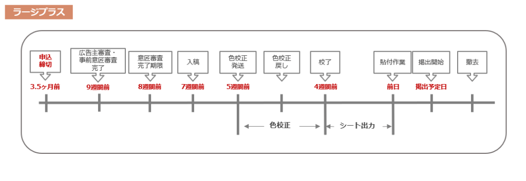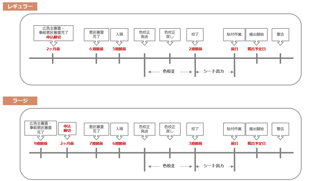 ・レギュラー・ラージは掲出作業日の2ヶ月前まで、ラージプラスは掲出作業日の3.5ヶ月前までにお申し込みをお願いいたします。