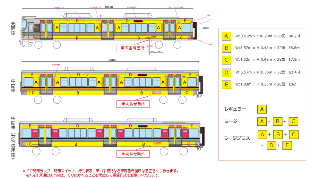 ●掲出開始及び終了日、車両編成は車両運用との調整により決定します。●広告料金には掲出シート製作費、掲出撤去費を含みます。