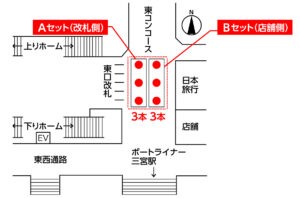 ●三ノ宮駅アドコラムの3本セットのみお申し込みの場合、残りの3本セットは引き続き販売となるため、他社が入る場合がございます。ただし、先にお申し込みいただいた広告主様と同業の掲出は致しませんので、事前にお問い合わせください。
